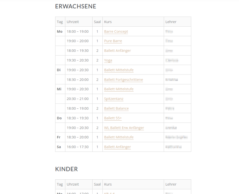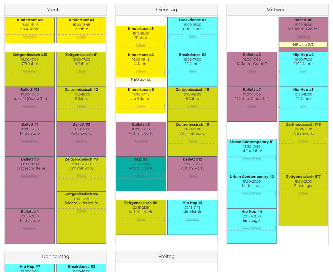 Die erste Funktion des PlugIns ist die Erzeugung einer Ansicht Ihres Kursplans auf Ihrer WordPress-Website. Der Plan ist automatisch aktuell, denn er lädt die Daten »im Hintergrund« direkt von StudioIntern. Sie müssen nie wieder Ihren Kursplan manuell in WordPress aktualisieren. Die Art der Darstellung kann individuell angepasst werden, so dass er zum restlichen Design Ihrer Website passt. Diese Anpassung ist ein kostenpflichtige Zusatzleistung, die wir Ihnen gerne anbieten (je nach Aufwand ca. 250,00 bis 350,00 € netto).